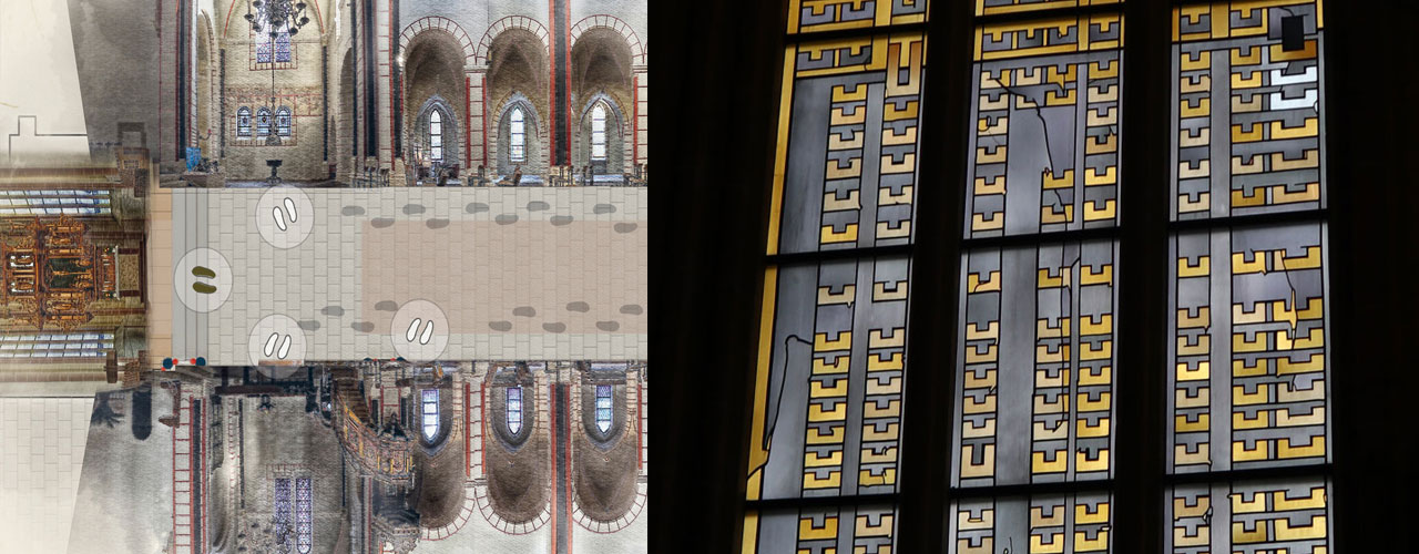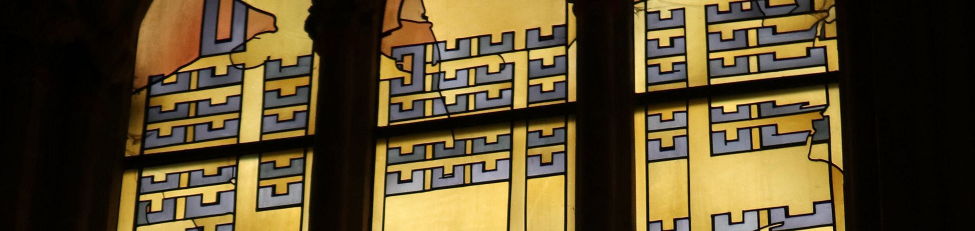Prägendes Element in den modernen Glasfenstern ist die nach oben offene Klammer – ein Sinnbild für den Menschen, der die Arme zum Himmel aufhebt.
